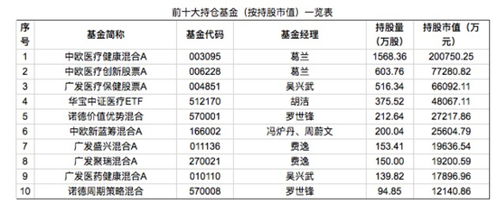 其中,明星基金经理葛兰管理的3只基金中欧医疗健康混合、中欧医疗创新股票和中欧阿尔法混合分别位列公司第2、第6、第9大流通股股东。中欧医疗健康混合持股数未变,中欧医疗创新股票增持了55万股,中欧阿尔法混合新进前十,持股为244万股,合计增持约299万股。