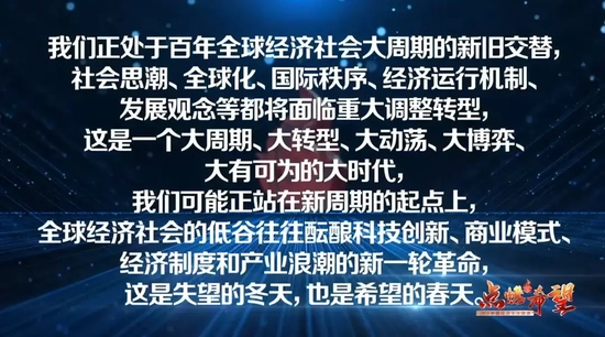 第二大预测:我们正处于百年全球经济社会大周期的新旧交替,社会思潮、全球化、国际秩序、经济运行机制、发展观念等都将面临重大调整转型,这是一个大周期、大转型、大动荡、大博弈、大有可为的大时代,我们可能正站在新周期的起点上,全球经济社会的低谷往往酝酿科技创新、商业模式、经济制度和产业浪潮的新一轮革命,这是失望的冬天,也是希望的春天