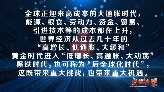 第三大预测:全球正迎来高成本的大通胀时代,能源、粮食、劳动力、资金、贸易、引进技术等的成本都在上升,世界经济从过去几十年的“高增长、低通胀、大缓和”黄金时代进入“低增长、高通胀、大动荡”黑铁时代,也可称为“后全球化时代”,这既带来重大挑战,也带来重大机遇。