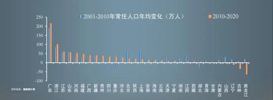 从省份看,2010-2020年年均常住人口增量前五的省是广东、浙江、江苏、山东、河南,此时期甘肃、内蒙古、山西、辽宁、吉林、黑龙江等6省人口萎缩。