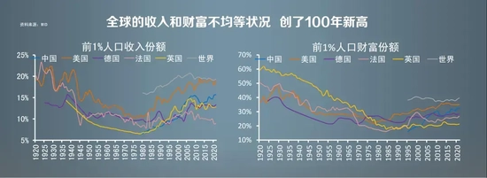 但是,到了上世纪80年代,全球出现了严重的“滞胀”现象,就是经济低迷但通胀非常高,经济学家认为主要是“凯恩斯主义”的措施用过头了,政府对经济干预过多、市场活力下降,加上超发货币,于是以芝加哥学派为代表的新自由主义思潮兴起,强调减少政府干预,鼓励资本自由化,重视经济效率而不是分配公平。于是,从1980年到现在,在全球化、资本自由化、经济金融化、赤字货币化等推动下,全球经济高速增长,一片繁荣,但是与此同时,全球的收入分配状况却快速恶化,到2020年前后,全球收入分配不均等程度创百年新高,达到了1920年前后的水平。