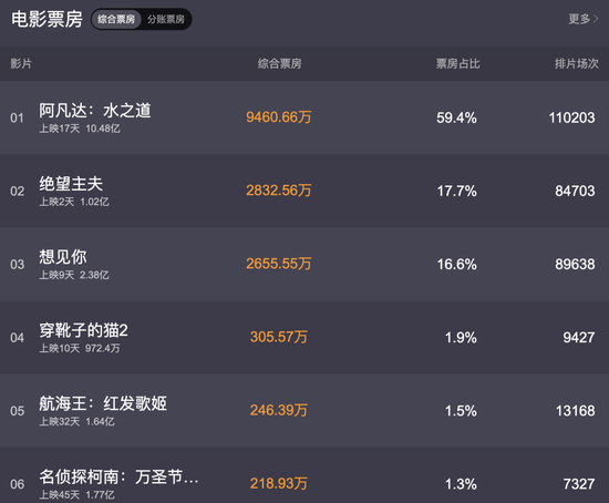 随着全国电影院有序开放,元旦档电影票房数据向好。1月1日,2023年元旦档总票房(含预售)突破3亿元。《阿凡达:水之道》《想见你》《绝望主夫》位列元旦档票房榜前三位;其中,《阿凡达:水之道》元旦档票房接近1.4亿元。