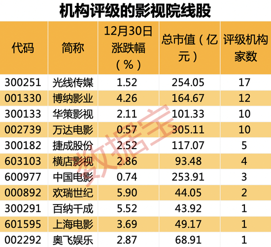 证券时报·数据宝统计,从机构关注度来看,光线传媒、博纳影业、华策影视、万达电影受机构高度关注,评级机构家数均在10家以上。