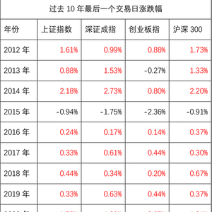 从过去10年的数据来看,每年的最后一个交易日基本上都是收涨,沪深300、上证指数以及深证成指更是仅在2015年的最后一个交易日下跌,上涨概率高达90%。