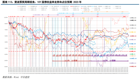 展望2023年,如图表113,斐波那契周期技术面倾向,10Y国债收益率在全年的主要波动区间预计在[2.56%-3.14%]以内,波动中枢预计在[2.81%-2.92%]附近,上半年技术面以边际回升、或回升到位后震荡整固为主,之后预计在6-7月,随经济第一波恢复达峰后、或由海外衰退压力传导等潜在因素,收益率可开启区间内有限下行,三季度末至四季度收益率将视基本面情况再度选择方向,如基本面相对平稳、无显著方向,收益率将倾向继续围绕[2.81%-2.92%]潜在波动中枢整固震荡。