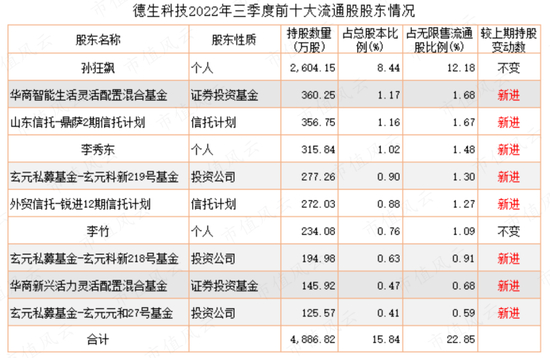 2022年三季度,德生科技(002908.SZ)的前十大流通股股东中有8席新进股东,其中,玄元私募旗下的3只基金、2只是带“玄元科新”二字的基金入列。