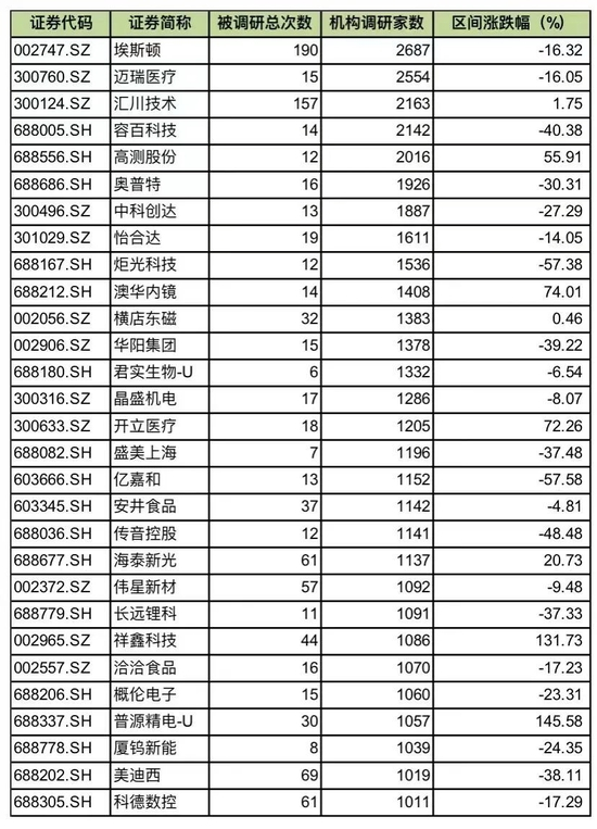 接下来,我们再看看全年表现最好的十只个股,看看他们的表现与机构调研之间的关系。