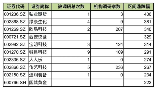 没有被机构调研的西安饮食(000721.SZ)与园城黄金,则分别取得了329%以及222%的涨幅。西安饮食,主要是受益于疫情放松以及消费的回暖。