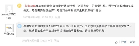 1月5日,华润双鹤在上证e互动平台回应投资者提问时也表示,阿兹夫定片现已开始生产,公司按照真实生物订单需求制定生产计划,该药品的生产不会对公司业绩造成明显影响。