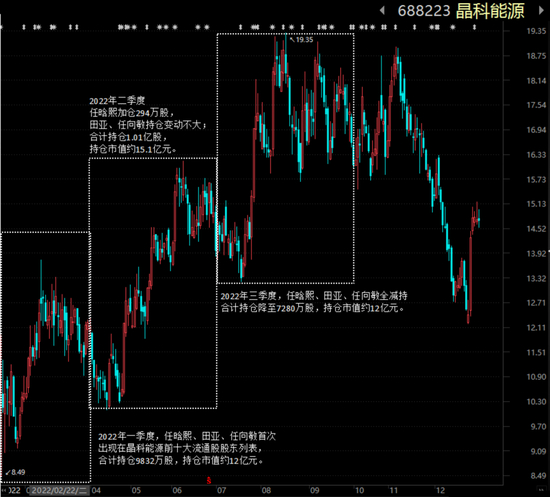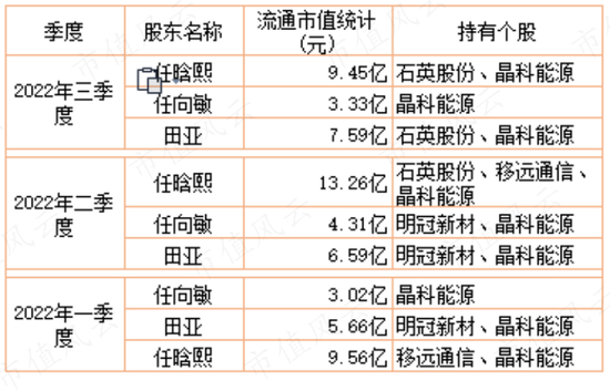 2022年一季度,任晗熙、田亚、任向敏三个账户再次共同出现在晶科能源(688223.SH)前十大流通股股东列表上,分别为第一、二、五位,合计持有9832万股。按2022年3月31日收盘价12.24元/股测算,持仓市值合计12亿元。