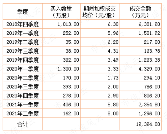 按每个季度期间加权成交均价估算王新在对应季度的买入价格,综合测算,在2021年二季度末,王新持有4410万股的总成本2亿元左右,平均4.54元/股。