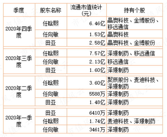 2020年四季度,任向敏退出前十大流通股股东列表,任晗熙持仓降至165万股,持仓市值约1.8亿元。
