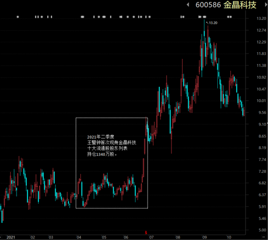 在天齐锂业上收获可观利润后,2021年二季度,王暨钟转载金晶科技(600586.SH),买入1340万股,持仓市值约1.25亿元。金晶科技当期涨幅以及下一季度涨幅都比较大。