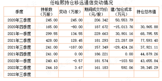 2020年三季度,任晗熙、任向敏同时现身移远通信的前十大流通股股东列表,合计持仓352万股,持仓市值约4.1亿元。