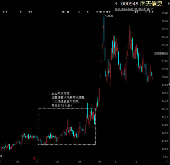 就在今年三季度,南天信息(000948.SZ)在9月29日至10月18日的9个交易日里,出现7个涨停,区间涨幅超过100%。而就在这之前的三季度末,王暨钟持有南天信息328万股,位列十大流通股股东的第五位。