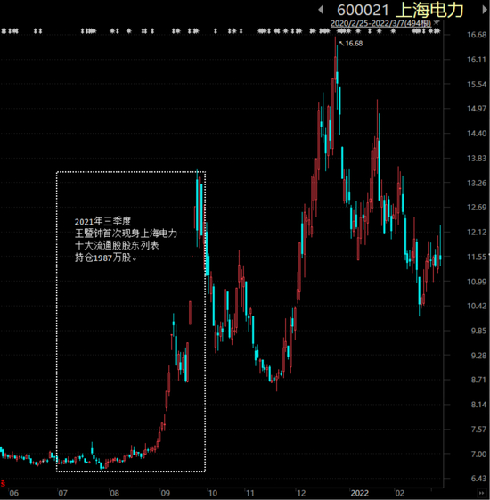 如果说金晶科技总市值比较小,容易控盘,那么,王暨钟在2021年三季度买入上海电力(600021.SH)1987万股,持仓市值约2.5亿元,显示出其对市场大热点的把握非常强。