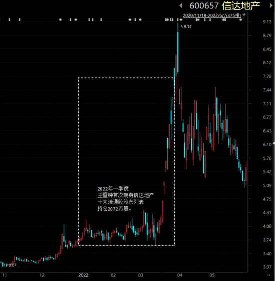 2022年一季度,房地产、建筑等板块出现一轮强势上涨,非常巧,信达地产(600657.SH)、光大嘉宝(600622.SH)、宏润建设(002062.SZ)等当期热门股,王暨钟再次出现在它们的前十大流通股股东列表上。