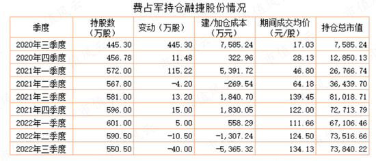 按2022年9月30日收盘价测算,费占军手上股票市值在7.3亿元左右,账面浮盈超过6.3亿元。