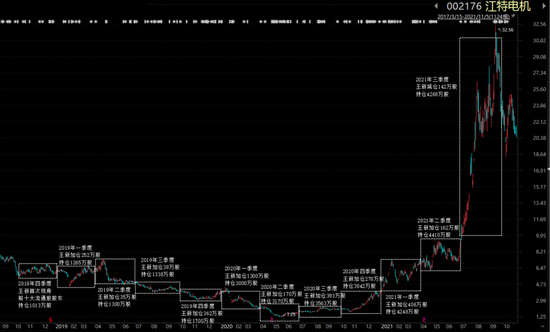2018年四季度,王新首次现身前十大流通股股东列表,随后连续10个季度加仓,从最初的1013万股,增持至4410万股,直到2021年三季度,江特电机股价出现快速拉升才减持,但不多。