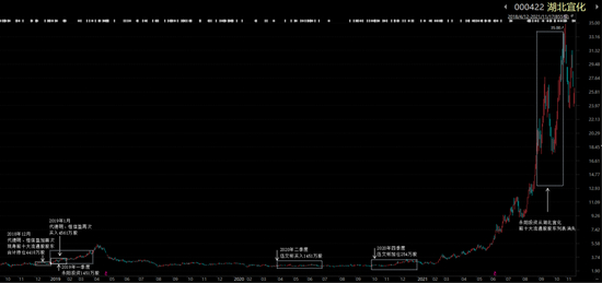 直到2021年2月,湖北宜化股价从3.3元/股开始启动,到11月1日创下35元/股历史新高,区间涨幅超过900%。