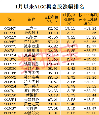 数据宝统计,截至1月11日收盘,AIGC概念股合计A股市值3911亿元。今年以来,AIGC概念指数涨幅2.65%,小幅跑赢同期上证指数。二六三、盛视科技、拓尔思、中科金财、数字政通等股涨幅排前五位。