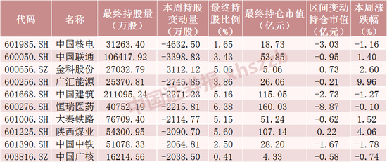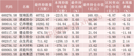 本周持仓市值减少额居前十的股票均被北向资金减仓,其中恒瑞医药、通威股份、以岭药业、歌尔股份、众生药业、金地集团被北向资金减仓超1000万股。