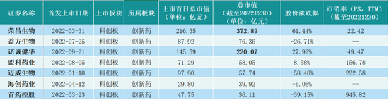 2022年登陆科创板的医疗产业中,创新药板块是公司数量最多的,共有7家创新药公司完成上市,但却仅有荣昌生物和诺诚健华两家公司市值突破百亿,截至2022年12月30日,总市值分别为372.89亿和220.07亿,较上市首日市值分别上涨61.44%和27.92%,是为数不多的实现两位数增长的创新药公司。其他几家今年新上市的创新药公司市值在资本市场关注度不高,甚至总市值较首发市值有所降低。