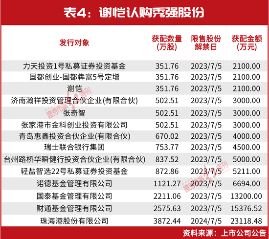 秀强股份2022年底落地的一项增发15477.39万股、募资9.24亿元的定增中,谢恺认购351.76万股,耗资2100万元(见表4)。