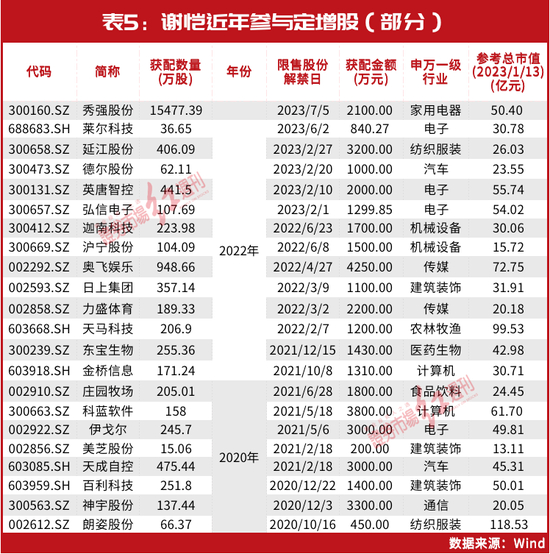 而拉长周期来看,秀强股份只是其参与定增的冰山一角。在近几年的上市公司定增名单中,谢恺已经成为定增的“常客”。