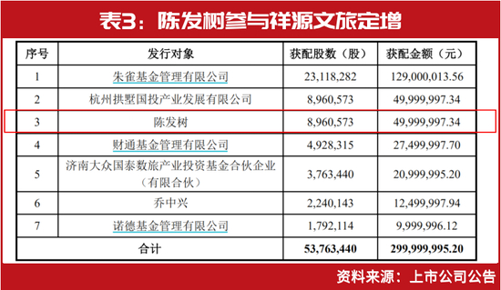 在祥源文旅2022年12月刚刚落地的一项定增中,陈发树就现身其中,在祥源文旅发行5376.34万股、募资3亿元的定增获配名单中,陈发树获配896.06万股,耗资5000万元(见表3)。