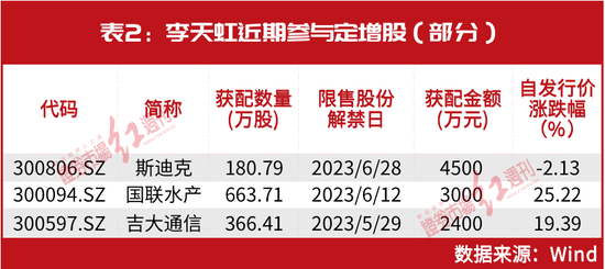 在斯迪克刚刚落地的一项定增中,李天虹就现身其中,其共认购180.79万股,认购金额为4500万元。除了斯迪克,李天虹还参与了国联水产、吉大通信等公司的定增,对于两家公司的定增股份分别认购663.71万股、366.41万股,投入资金分别为3000万元与2400万元(见表2)。