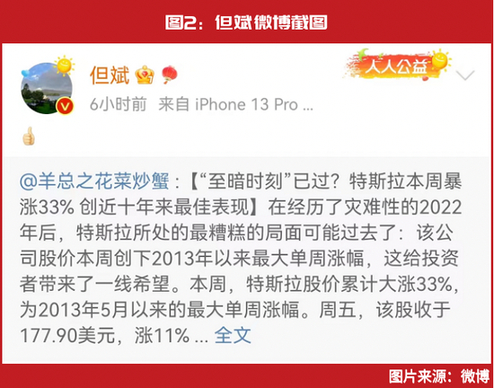 这为重仓特斯拉的投资者发了一份“大红包”,部分知名投资者甚至公开为特斯拉的大涨“点赞”,私募大佬但斌就是其中之一。据悉,在一篇名为《“至暗时刻”已过?特斯拉本周暴涨33% 创近十年来最佳表现》的微博中,博主表示,“在经历了灾难性的2022年后,特斯拉所处的最糟糕的局面可能过去了……”但斌则在其下以“点赞”回复(见图2)。
