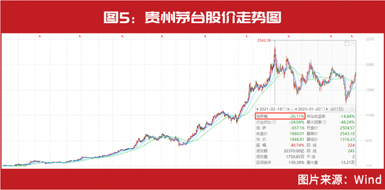 目前,贵州茅台股价最新报1860.01元/股,相比2021年2月18日创出历史高点时折价达26.11%(见图5)。这意味着,在不提价的情况下,但斌认为,贵州茅台股价未来至少还有26.11%的上涨空间。