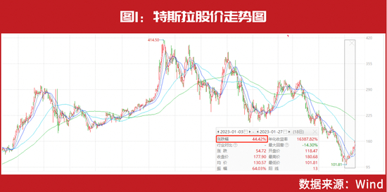 在此多重利好之下,特斯拉股价在开年以来不断上涨,仅仅18个交易日就已大涨44.42%(见图1)。尤其是在1月25日特斯拉发布2022年全年净利润大涨之后,公司股价连续2个交易日的涨幅均超过10%。