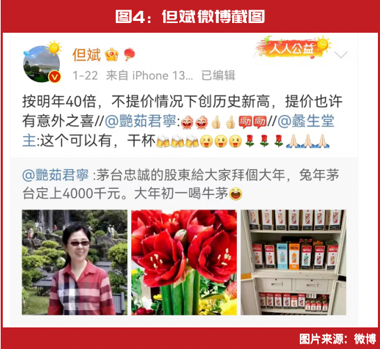 近期,但斌再次发声“力挺”贵州茅台。有网友在微博上表示,“兔年茅台(股价)定上4000元。”随后,但斌在其下留言称,“按明年40倍(市盈率),不提价情况下(茅台股价)创历史新高,提价也许有意外之喜”(见图4)。