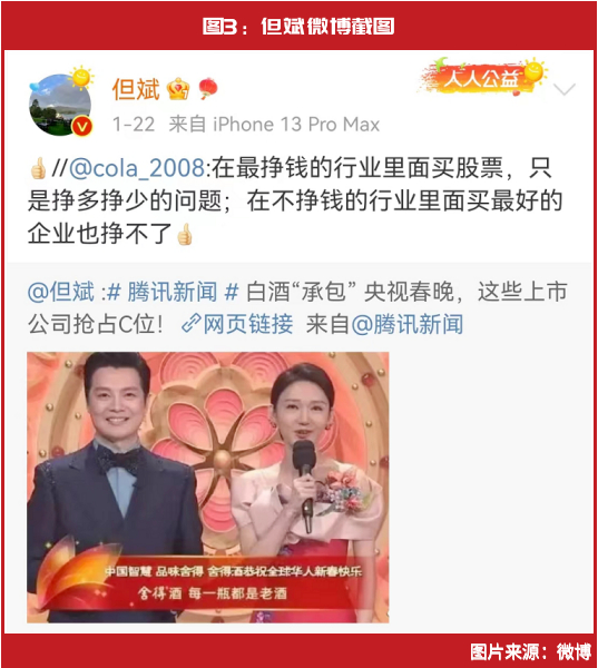 市场对此褒贬不一,有的认为,“还得是白酒,日子滋润”;有的认为,白酒行业“内卷”加剧。但斌则转发了一篇名为《白酒“承包” 央视春晚,这些上市公司抢占C位!》的微博,并对一位网友的留言“在最挣钱的行业里面买股票,只是挣多挣少的问题;在不挣钱的行业里面买最好的企业也挣不了”给与了“点赞”回复(见图3)。从这方面看,在但斌心目中,白酒仍是A股市场上最挣钱的行业之一。