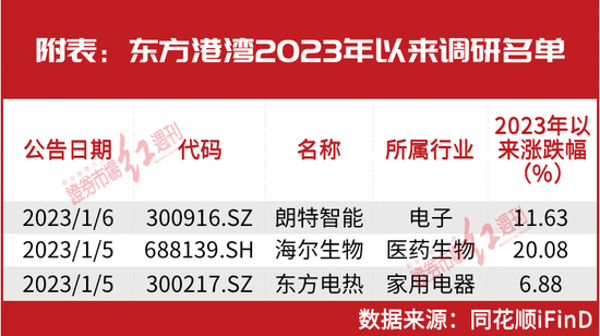 在2023年以来,但斌仍延续了这种策略。如最新机构调研数据显示,但斌旗下的东方港湾最新出现在朗特智能、海尔生物和东方电热三家公司的机构调研名单,而这三家公司分别属于电子(半导体)、医药生物和家用电器行业(见附表)。