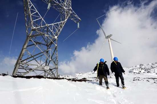南方电网用“一张表”推进各个治理主体履职尽责。图为南网贵州六盘水供电局员工在海拔2500多米的六盘水市四格风电场巡视检查风力发电输出线路。(李泵 摄)