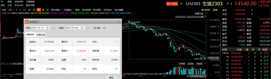 截至2月6日收盘,生猪2303合约上涨了2.72%,收盘报价14540元/吨。然而,生猪2303合约近期曾在盘中触及14035元/吨的低点,创下近十个月的新低。东方财富Choice数据显示,自去年10月19日至今,生猪2303合约已累计下跌31.09%。