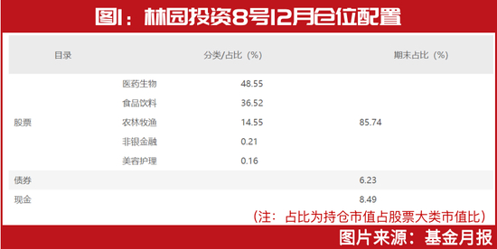 除此之外,该策略报告还透露了林园投资8号基金的仓位配置。具体来看,资产配置主要分布在股票、债券与现金,其中股票仓位配置占比最高为85.74%,债券为6.23%,现金为8.49%。在股票资产的配置中,医药生物占比最高为48.55%,其次为食品饮料,占比为36.52%,另外,农林牧渔、非银金融与美容护理分别占比14.55%、0.21%与0.16%(见图1)。