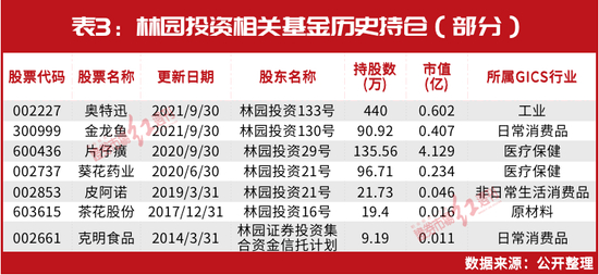 回顾林园相关基金的历史持仓,多数均为与嘴巴相关的消费股,如“油茅”金龙鱼,以截至2021年9月30日的数据来看,林园投资130号基金持有90.92万股股份,持仓市值为0.40亿元;对于中药股片仔癀,在其披露的截至2020年9月30日的股东持仓中,林园投资29号基金持仓135.56万股,持仓市值达4.12亿元。另外,在克明食品2014年3月31日披露的机构持仓中,林园证券集合资金信托计划也有持仓(见表3)