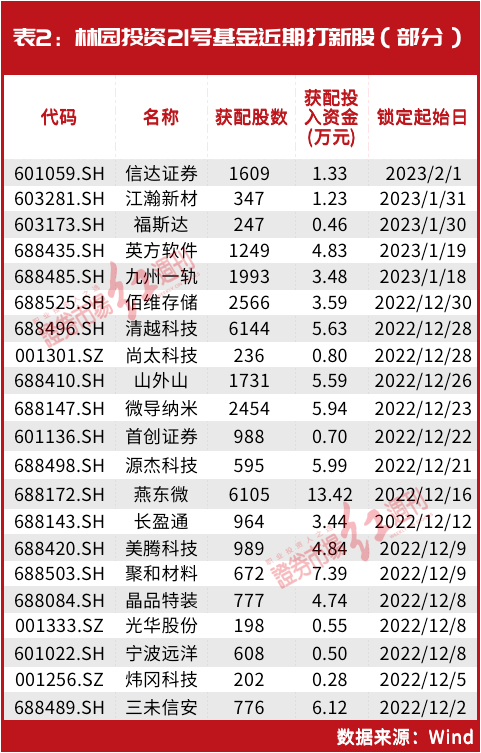 其中,林园投资21号基金获配金额最高为近240万元,近期,该基金出现在信达证券、江瀚新材、福斯达、英方软件、九州一轨等多家公司的打新名单中。如在2月1日上市的信达证券,林园投资21号基金获配投入1.33万元(见表2)。