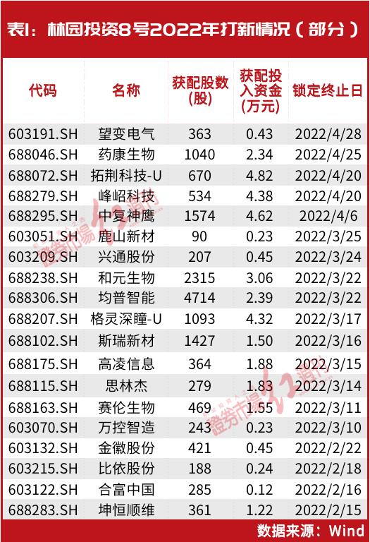 如2022年上半年,林园投资8号基金出现在多家公司的打新名单中。如在2022年4月上市的望变电气新股首发中,林园投资旗下约200只基金获配,累计获配金额80余万元。其中,林园投资8号私募投资基金获配363股,获配金额为0.4305万元。