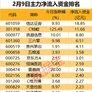 流入资金较多的还有C裕能、浪潮信息、三六零、贵州茅台等,主力资金净流入均超4亿元。股价表现方面,景嘉微、省广集团、天音控股等涨停。