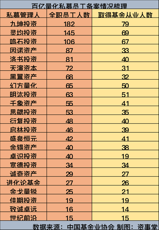 资事堂分梳理了各大机构的备案信息,全职员工人数在百亿量化机构中颇为悬殊,具备基金从业人员的比例也各不同相同。