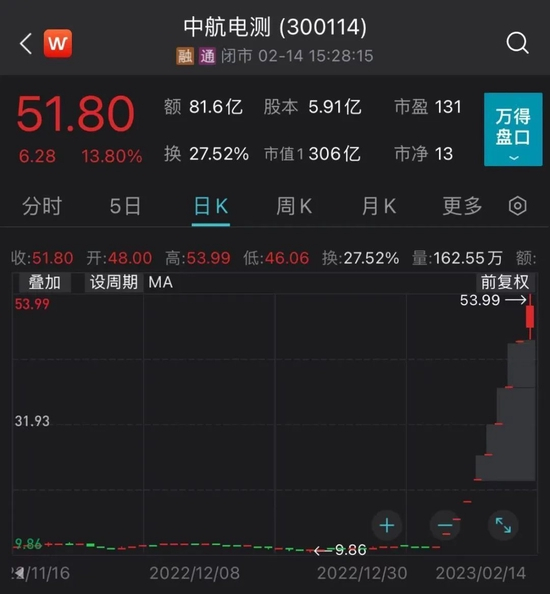 中航电测(300114)今日再度强势拉升,盘中一度冲击涨停,最高至53.99元,再度刷新历史新高。截至收盘,该股上涨13.8%报51.8元,全日成交81.6亿元,最新市值306亿元。至此,该股近9个交易日已累计大涨近4倍。此前,该股连续8个交易日一字“20cm”涨停。