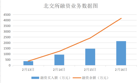 从两融数据来看,北交所数据显示,13日投资者融资买入25只北交所两融标的股票,占首批两融标的股票数量的45%,融资买入成交额合计372.31万元。第二天融资买入金额激增到946万,此后一路高涨,截至2月16日,当日投资者融资买入42只北交所两融标的股票,占首批两融标的股票数量的76.8%,融资买入成交额合计更是突破2000万元。
