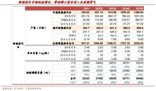 中泰证券测算,目前单辆新能源车约需要3-4kg磁材,假设2025年全球新能源汽车销量达到约2200万辆左右,预计2025年新能源车对稀土永磁需求量将达到8万吨(不考虑多电机车型增加带来的单车钕铁硼用量增加),占比将提升至20%以上,占高性能钕铁硼比例将达到34%。