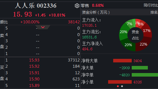 大消费午后走强,人人乐涨停,西安饮食触及涨停,全聚德、西安旅游、曲江文旅、徐家汇等跟涨。