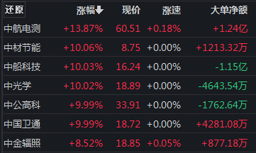 此外,“中字头”股票走势活跃,中材节能、中船科技、中光学等多股涨停。中航电测涨超13%,股价创历史新高。
